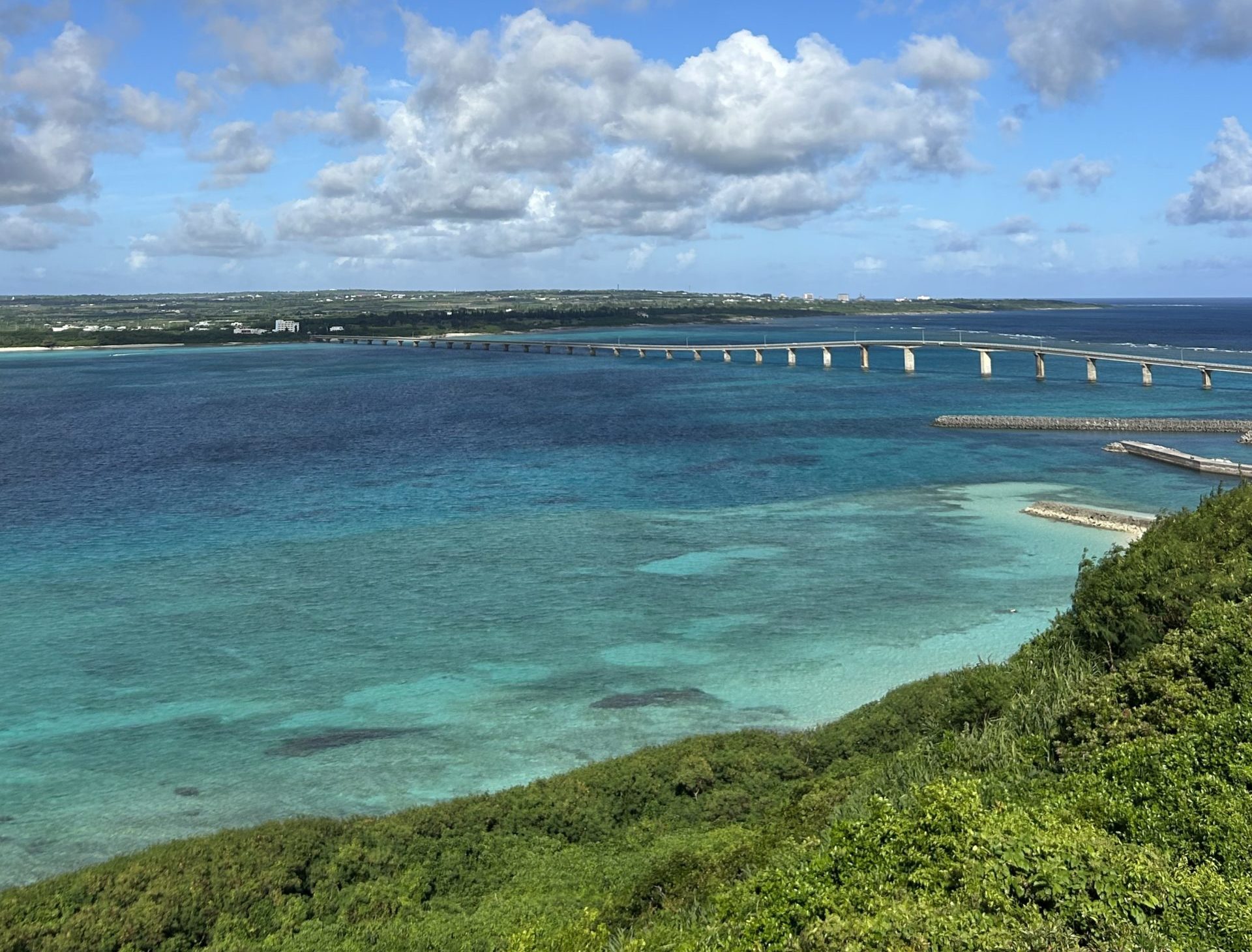 宮古島の北部にある「池間大橋」は、青い海の上をまっすぐに伸びる美しい橋。